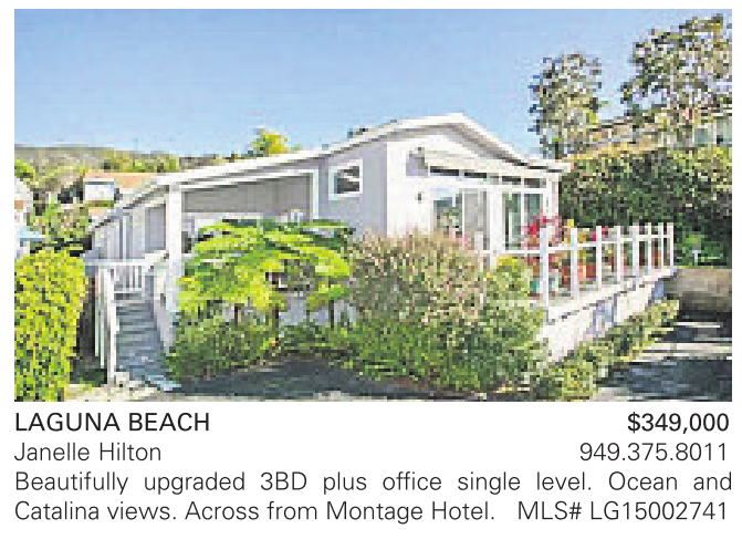 LAGUNA BEACH $349,000 Janelle Hilton 949.375.8011 Beautifully upgraded 3BD plus office single level. Ocean and Catalina views. Across from Montage Hotel. MLS# LG15002741