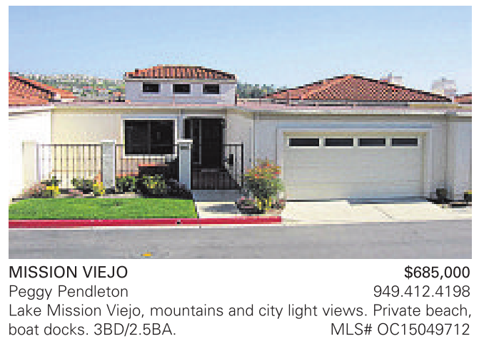 MISSION VIEJO $685,000 Peggy Pendleton 949.412.4198 Lake Mission Viejo, mountains and city light views. Private beach, boat docks. 3BD/2.5BA. MLS# OC15049712