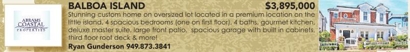 BALBOA ISLAND $3,895,000 Stunning custom home on oversized lot located in a premium location on the little island. 4 spacious bedrooms (one on first floor), 4 baths, gourmet kitchen, deluxe master suite. large front patio, spacious garage with built in cabinets, t R third floor roof deck & more! Ryan Gunderson 949.873.3841