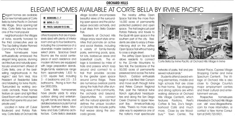 homes are available for new homebuyers at Corte Bella by Irvine PacificinOrchard Hills Village. Since opening last May, Corte Bella has become one of the most-popular neighborhoods in the Villages of Irvine, recently honored for the third consecutive year as “The Top-Selling Master Planned