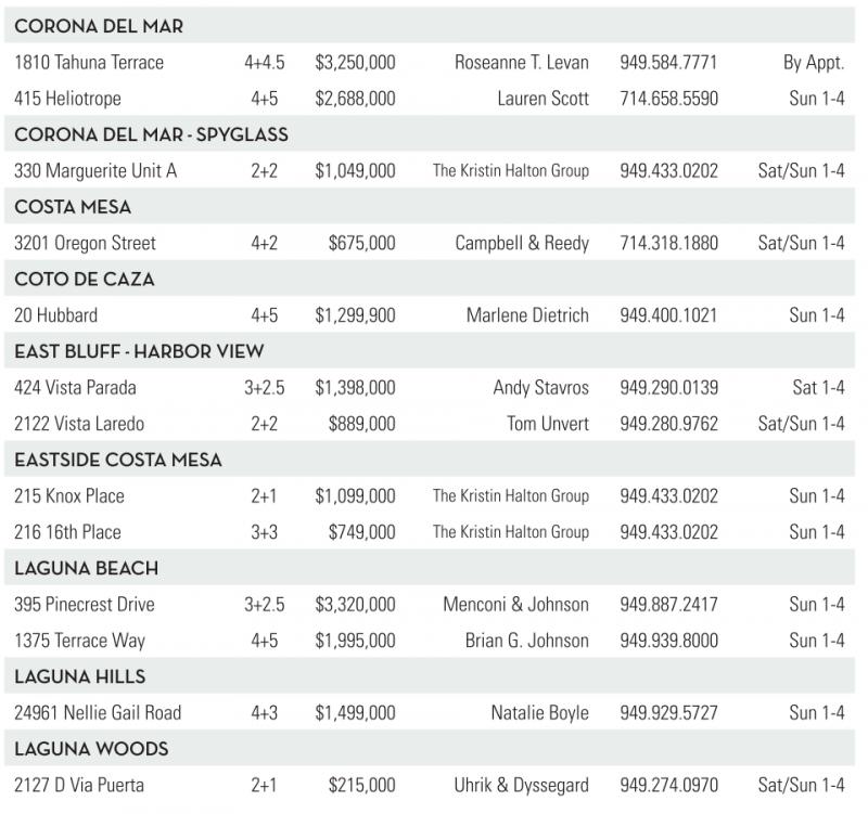 CORONA DEL MAR 1810 Tahuna Terrace 4+4.5 $3,250,000 Roseanne T. Levan 949.584.7771 By Appt. 415 Heliotrope 4+5 $2,688,000 Lauren Scott 714.658.5590 Sun 1-4 CORONA DEL MAR -SPYG SS 330 Marguerite Unit A 2+2 $1,049,000 The Kristin Halton Group 949.433.0202 Sat/Sun 1-4 COSTA MESA 3201 Oregon Street 4+2 $675,000 Campbell &Reedy 714.318.1880 Sat/Sun 1-4 COTO DE CAZA 20 Hubbard 4+5 $1,299,900 Marlene Dietrich 949.400.1021 Sun 1-4 EASTBLUFF -HARBOR VIEW 424 Vista Parada 3+2.5 $1,398,000 Andy Stavros 949.290.0139 Sat 1-4 2122 Vista Laredo 2+2 $889,000 TomUnvert 949.280.9762 Sat/Sun 1-4 EASTSIDE COSTA MESA 215 Knox Place 2+1 $1,099,000 The Kristin Halton Group 949.433.0202 Sun 1-4 216 16th Place 3+3 $749,000 The Kristin Halton Group 949.433.0202 Sun 1-4 GUNA BEACH 395 Pinecrest Drive 3+2.5 $3,320,000 Menconi &Johnson 949.887.2417 Sun 1-4 1375 Terrace Way 4+5 $1,995,000 Brian G. Johnson 949.939.8000 Sun 1-4 GUNA HILLS 24961 Nellie Gail Road 4+3 $1,499,000 Natalie Boyle 949.929.5727 Sun 1-4 GUNA WOODS 2127 DVia Puerta 2+1 $215,000 Uhrik &Dyssegard 949.274.0970 Sat/Sun 1-4