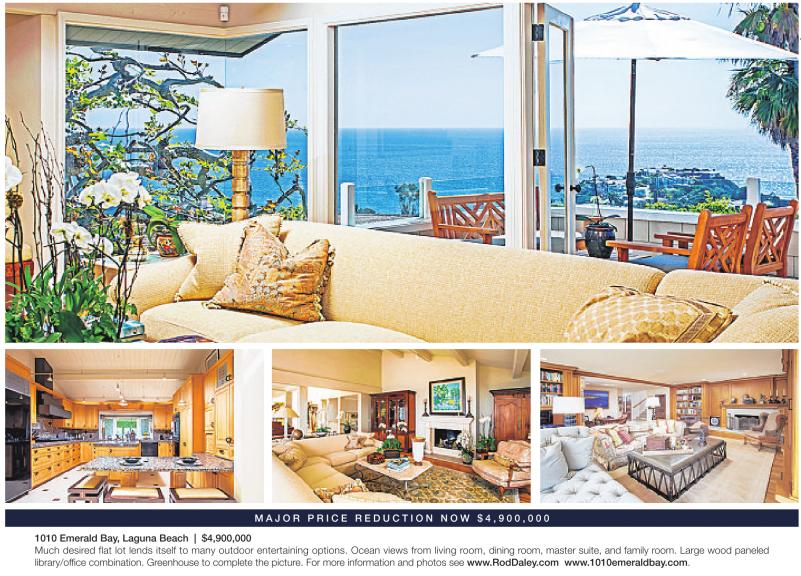 M A J O R P R I C E R E D U C T I O N N O W $ 4 , 9 0 0 , 0 0 0 1010 Emerald Bay, Laguna Beach | $4,900,000 Much desired flat lot lends itself to many outdoor entertaining options. Ocean views from living room, dining room, master suite, and family room. Large wood paneled library/office combination. Greenhouse to complete the picture. For more information and photos see www.RodDaley.com www.1010emeraldbay.com. See also