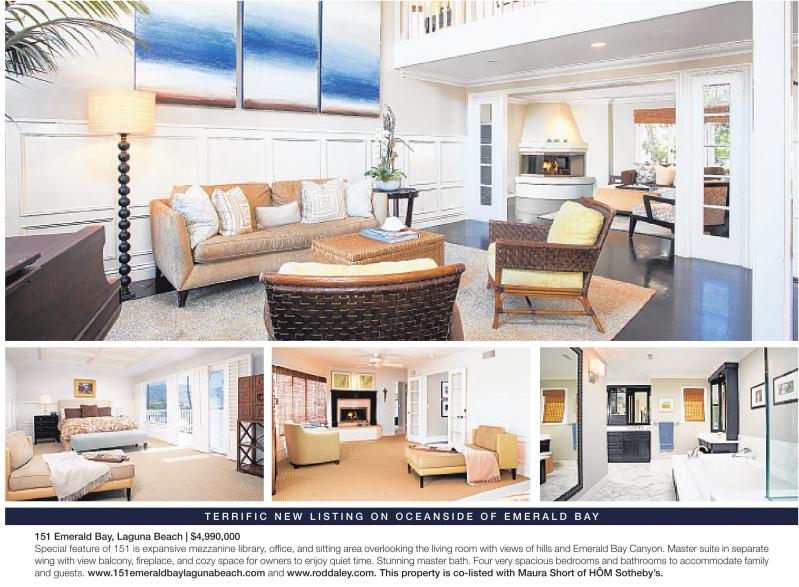 151 Emerald Bay, Laguna Beach | $4,990,000 Special feature of 151 is expansive mezzanine library, office, and sitting area overlooking the living room with views of hills and Emerald Bay Canyon. Master suite in separate wing with view balcony, fireplace, and cozy space for owners to enjoy quiet time. Stunning master bath. Four very spacious bedrooms and bathrooms to accommodate family and guests. www.151emeraldbaylagunabeach.com and www.roddaley.com. This property is co-listed with Maura Short of HÔM Sotheby’s.