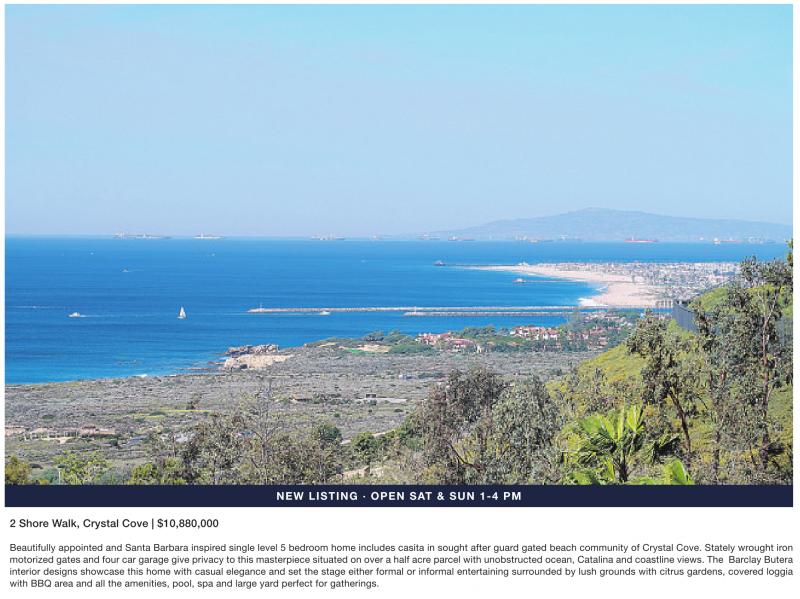NEW LISTING · OPEN SAT & SUN 1-4 PM 2 Shore Walk, Crystal Cove | $10,880,000 Beautifully appointed and Santa Barbara inspired single level 5 bedroom home includes casita in sought after guard gated beach community of Crystal Cove. Stately wrought iron motorized gates and four car garage give privacy to this masterpiece situated on over a half acre parcel with unobstructed ocean, Catalina and coastline views. The Barclay Butera interior designs showcase this home with casual elegance and set the stage either formal or informal entertaining surrounded by lush grounds with citrus gardens, covered loggia with BBQ area and all the amenities, pool, spa and large yard perfect for gatherings.
