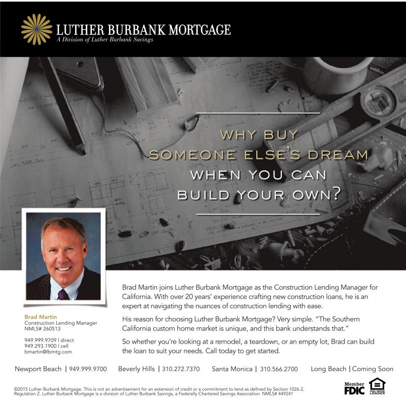 why buy someone else’s dream when you can build your own? Brad Martin Construction Lending Manager NMLS# 260513 949.999.9709 | direct 949.293.1900 | cell bmartin@lbmtg.com Newport Beach 949.999.9700 Brad Martin joins Luther Burbank Mortgage as the Construction Lending Manager for California. With over 20 years’ experience crafting new construction loans, he is an expert at navigating the nuances of construction lending with ease. His reason for choosing Luther Burbank Mortgage? Very simple. “The Southern California custom home market is unique, and this bank understands that.” So whether you’re looking at a remodel, a teardown, or an empty lot, Brad can build the loan to suit your needs. Call today to get started. Beverly Hills 310.272.7370 Santa Monica 310.566.2700 Long Beach Coming Soon ©2015 Luther Burbank Mortgage. This is not an advertisement for an extension of credit or a commitment to lend as defined by Section 1026.2, Regulation Z. Luther Burbank Mortgage is a division of Luther Burbank Savings, a Federally Chartered Savings Association. NMLS# 449241