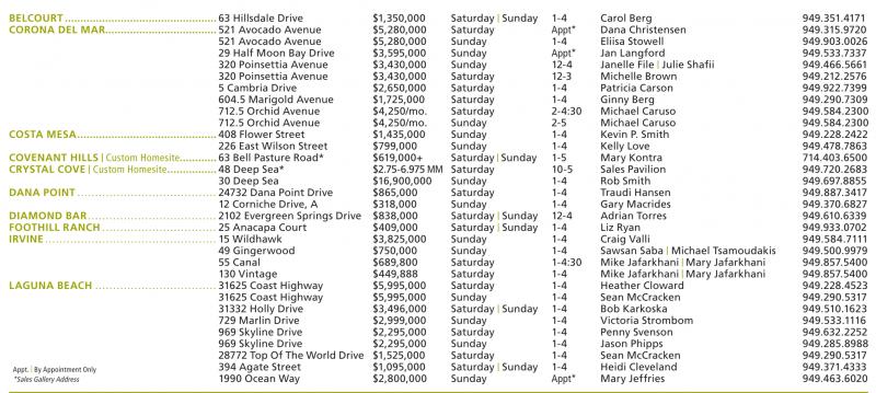 BELCOURT ................................................. 63 Hillsdale Drive $1,350,000 Saturday | Sunday 1-4 Carol Berg 949.351.4171 CORONA DEL MAR.................................... 521 Avocado Avenue $5,280,000 Saturday Appt* Dana Christensen 949.315.9720 521 Avocado Avenue $5,280,000 Sunday 1-4 Eliisa Stowell 949.903.0026 29 Half Moon Bay Drive $3,595,000 Sunday Appt* Jan Langford 949.533.7337 320 Poinsettia Avenue $3,430,000 Sunday 12-4 Janelle File | Julie Shafii 949.466.5661 320 Poinsettia Avenue $3,430,000 Saturday 12-3 Michelle Brown 949.212.2576 5 Cambria Drive $2,650,000 Saturday 1-4 Patricia Carson 949.922.7399 604.5 Marigold Avenue $1,725,000 Saturday 1-4 Ginny Berg 949.290.7309 712.5 Orchid Avenue $4,250/mo. Saturday 2-4:30 Michael Caruso 949.584.2300 712.5 Orchid Avenue $4,250/mo. Sunday 2-5 Michael Caruso 949.584.2300 COSTA MESA............................................. 408 Flower Street $1,435,000 Sunday 1-4 Kevin P. Smith 949.228.2422 226 East Wilson Street $799,000 Sunday 1-4 Kelly Love 949.478.7863 COVENANT HILLS | Custom Homesite............ 63 Bell Pasture Road* $619,000+ Saturday | Sunday 1-5 Mary Kontra 714.403.6500 CRYSTAL COVE | Custom Homesite................ 48 Deep Sea* $2.75-6.975 MM Saturday 10-5 Sales Pavilion 949.720.2683 30 Deep Sea $16,900,000 Sunday 1-4 Rob Smith 949.697.8855 DANA POINT....................................... 24732 Dana Point Drive $865,000 Saturday 1-4 Traudi Hansen 949.887.3417 12 Corniche Drive, A $318,000 Sunday 1-4 Gary Macrides 949.370.6827 DIAMOND BAR.................................... 2102 Evergreen Springs Drive $838,000 Saturday | Sunday 12-4 Adrian Torres 949.610.6339 FOOTHILL RANCH................................ 25 Anacapa Court $409,000 Saturday | Sunday 1-4 Liz Ryan 949.933.0702 IRVINE................................................ 15 Wildhawk $3,825,000 Sunday 1-4 Craig Valli 949.584.7111 49 Gingerwood $750,000 Sunday 1-4 Sawsan Saba | Michael Tsamoudakis 949.500.9979 55 Canal $689,800 Saturday 1-4:30 Mike Jafarkhani | Mary Jafarkhani 949.857.5400 130 Vintage $449,888 Saturday 1-4 Mike Jafarkhani | Mary Jafarkhani 949.857.5400 LAGUNA BEACH .................................. 31625 Coast Highway $5,995,000 Saturday 1-4 Heather Cloward 949.228.4523 31625 Coast Highway $5,995,000 Sunday 1-4 Sean McCracken 949.290.5317 31332 Holly Drive $3,496,000 Saturday | Sunday 1-4 Bob Karkoska 949.510.1623 729 Marlin Drive $2,999,000 Sunday 1-4 Victoria Strombom 949.533.1116 969 Skyline Drive $2,295,000 Saturday 1-4 Penny Svenson 949.632.2252 969 Skyline Drive $2,295,000 Sunday 1-4 Jason Phipps 949.285.8988 28772 Top Of The World Drive $1,525,000 Saturday 1-4 Sean McCracken 949.290.5317 Appt. | By AppointmentOnly 394 Agate Street $1,095,000 Saturday | Sunday 1-4 Heidi Cleveland 949.371.4333 ................................................................... *Sales GalleryAddress 1990 Ocean Way $2,800,000 Sunday Appt* Mary Jeffries 949.463.6020