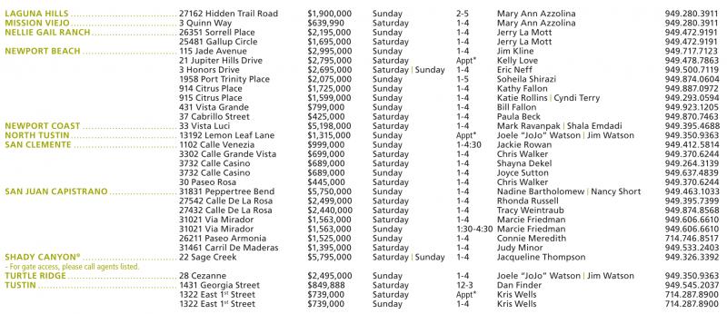 LAGUNA HILLS .................................... 27162 Hidden Trail Road $1,900,000 Sunday 2-5 Mary Ann Azzolina 949.280.3911 MISSION VIEJO.................................... 3 Quinn Way $639,990 Saturday 1-4 Mary Ann Azzolina 949.280.3911 NELLIE GAIL RANCH............................. 26351 Sorrell Place $2,195,000 Sunday 1-4 Jerry La Mott 949.472.9191 25481 Gallup Circle $1,695,000 Saturday 1-4 Jerry La Mott 949.472.9191 NEWPORT BEACH ................................ 115 Jade Avenue $2,995,000 Sunday 1-4 Jim Kline 949.717.7123 21 Jupiter Hills Drive $2,795,000 Saturday Appt* Kelly Love 949.478.7863 3 Honors Drive $2,695,000 Saturday | Sunday 1-4 Eric Neff 949.500.7119 1958 Port Trinity Place $2,075,000 Sunday 1-5 Soheila Shirazi 949.874.0604 914 Citrus Place $1,725,000 Sunday 1-4 Kathy Fallon 949.887.0972 915 Citrus Place $1,599,000 Sunday 1-4 Katie Rollins | Cyndi Terry 949.293.0594 431 Vista Grande $799,000 Sunday 1-4 Bill Fallon 949.923.1205 37 Cabrillo Street $425,000 Saturday 1-4 Paula Beck 949.870.7463 NEWPORT COAST ................................ 33 Vista Luci $5,198,000 Saturday 1-4 Mark Ravanpak | Shala Emdadi 949.395.4688 NORTH TUSTIN.................................... 13192 Lemon Leaf Lane $1,315,000 Sunday Appt* Joele “JoJo” Watson | Jim Watson 949.350.9363 SAN CLEMENTE ................................... 1102 Calle Venezia $999,000 Sunday 1-4:30 Jackie Rowan 949.412.5814 3302 Calle Grande Vista $699,000 Saturday 1-4 Chris Walker 949.370.6244 3732 Calle Casino $689,000 Saturday 1-4 Shayna Dekel 949.264.3139 3732 Calle Casino $689,000 Sunday 1-4 Joyce Sutton 949.637.4839 30 Paseo Rosa $445,000 Saturday 1-4 Chris Walker 949.370.6244 SAN JUAN CAPISTRANO....................... 31831 Peppertree Bend $5,750,000 Sunday 1-4 Nadine Bartholomew | Nancy Short 949.463.1033 27542 Calle De La Rosa $2,499,000 Saturday 1-4 Rhonda Russell 949.395.7399 27432 Calle De La Rosa $2,440,000 Saturday 1-4 Tracy Weintraub 949.874.8568 31021 Via Mirador $1,563,000 Saturday 1-4 Marcie Friedman 949.606.6610 31021 Via Mirador $1,563,000 Sunday 1:30-4:30 Marcie Friedman 949.606.6610 26211 Paseo Armonia $1,525,000 Sunday 1-4 Connie Meredith 714.746.8517 31461 Carril De Maderas $1,395,000 Saturday 1-4 Judy Minor 949.533.2403