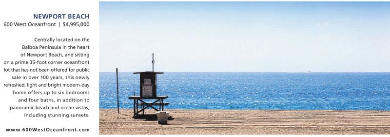 NEWPORT BEACH 600 West Oceanfront | $4,995,000 Centrally located on the Balboa Peninsula in the heart of Newport Beach, and sitting on a prime 35-foot corner oceanfront lot that has not been offered for public sale in over 100 years, this newly refreshed, light and bright modern-day home offers up to six bedrooms and four baths, in addition to panoramic beach and ocean vistas, including stunning sunsets. www.600WestOceanfront.com See also