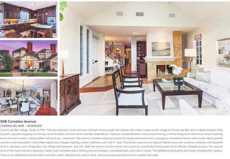 CORONA DEL MAR | $2,695,000 Corona del Mar Village, South of PCH. This four bedroom, three and one-half bath home exudes the warmth and charm unique to the village of Corona del Mar and is Ideally located close to parks, upscale shopping and dining, movie theaters, and the Corona del Mar State Beach. Features include Brazilian cherry wood flooring, a formal living room with French doors opening to the front brick patio, a library/office with built-ins, a travertine “fire and ice” fireplace opening to both the library and living room, a gorgeous remodeled kitchen with center island, granite counters and backsplash, Fisher-Pytel appliances, halogen lighting, custom cabinetry, and “eat-in” area. The kitchen opens to an adjacent family room with a wet bar complete with beautiful built-in cabinetry, wine refrigerator, two refrigerated drawers, and sink. Both the kitchen and the family room open to a southwest facing patio which affords complete privacy. The second level of the home include a spacious master suite complete with a sitting area and fireplace, remodeled bath, and walk-in closet. Two additional bedrooms and a bath complete the upstairs. There is an additional bedroom with a full bath, built-in Murphy bed, built-in desk, and bay window accessed by an outside staircase.