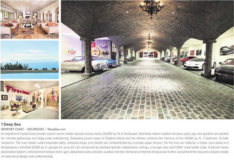 NEWPORT COAST | $20,995,000 | 1DeepSea.com A magnificent Crystal Cove private custom corner estate sprawls across nearly 26,000 sq. ftt of landscape. Seamless indoor-outdoor terraces, pool, spa, and gardens are perfect for intimate gatherings and large-scale entertaining. Sweeping ocean views of Catalina Island and the Harbor enhance the interiors of this 10,600 sq. ft., 7 bedroom, 12 bath residence. The luxe master suite’s separate baths, dressing areas, and closets are complimented by a private upper terrace. For the true car collector, a motor court leads to a temperature controlled 6,000 sq. ft. garage for up to 22 cars enhanced by barreled granite cobblestone ceilings, a lounge area and 1,500+ wine bottle cellar. A Savant Home Automation System, entertainment billiard room, gym, detached casita, elevator, outdoor kitchen, formal and informal dining areas further compliment this beyond compare estate of meticulous design and craftsmanship.
