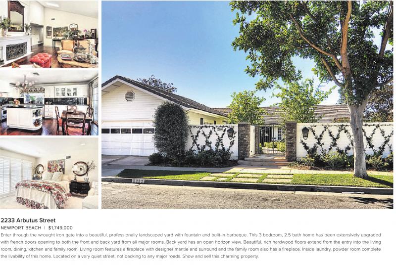 NEWPORT BEACH | $1,749,000 Enter through the wrought iron gate into a beautiful, professionally landscaped yard with fountain and built-in barbeque. This 3 bedroom, 2.5 bath home has been extensively upgraded with french doors opening to both the front and back yard from all major rooms. Back yard has an open horizon view. Beautiful, rich hardwood floors extend from the entry into the living room, dining, kitchen and family room. Living room features a fireplace with designer mantle and surround and the family room also has a fireplace. Inside laundry, powder room complete the livability of this home. Located on a very quiet street, not backing to any major roads. Show and sell this charming property.