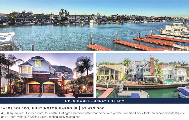OPEN HOUSE SUNDAY 1PM-5PM 16801 BOLERO, HUNTINGTON HARBOUR | $3,490,000 4,360 square feet, five bedroom, four bath Huntington Harbour waterfront home with private two-sided dock that can accommodate 60 foot and 40 foot yachts. Stunning views, meticulously maintained.