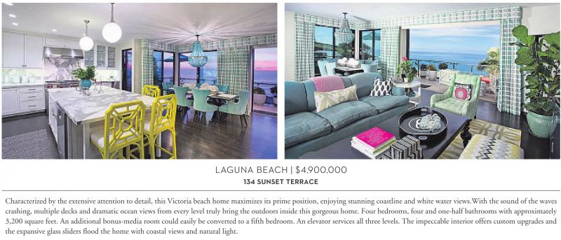 LAGUNA BEACH | $4,900,000 134 SUNSET TERRACE Characterized by the extensive attention to detail, this Victoria beach home maximizes its prime position, enjoying stunning coastline and white water views.With the sound of the waves crashing, multiple decks and dramatic ocean views from every level truly bring the outdoors inside this gorgeous home. Four bedrooms, four and one-half bathrooms with approximately 3,200 square feet. An additional bonus-media room could easily be converted to a fifth bedroom. An elevator services all three levels. The impeccable interior offers custom upgrades and the expansive glass sliders flood the home with coastal views and natural light.