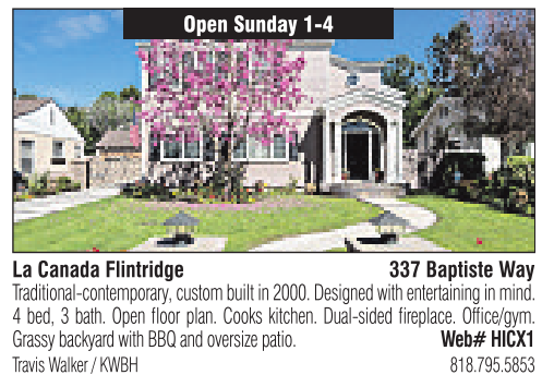 Open Sunday 1-4 La Canada Flintridge 337 Baptiste Way Traditional-contemporary,custom built in 2000.Designed withentertaining in mind. 4bed, 3bath. Open floor plan. Cooks kitchen. Dual-sided fireplace. Office/gym. Grassy backyardwithBBQ andoversize patio. Web# HICX1 Travis Walker/KWBH 818.795.5853 See also