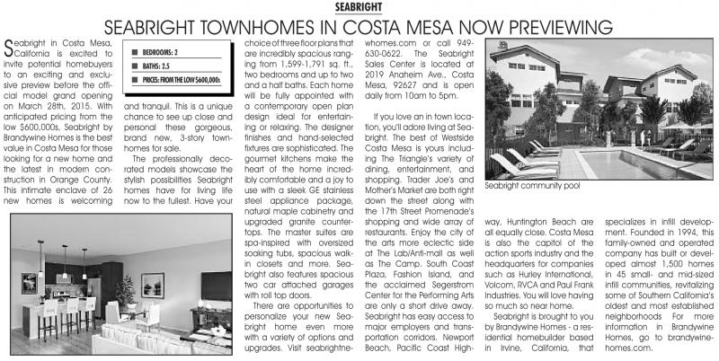 in Costa Mesa, California is excited to invite potential homebuyers to an exciting and exclusive preview before the official model grand opening on March 28th, 2015. With anticipated pricing from the low $600,000s, Seabright by Brandywine homes is the best value in Costa Mesa for those looking for a new home and the latest in modern construction in orange County.