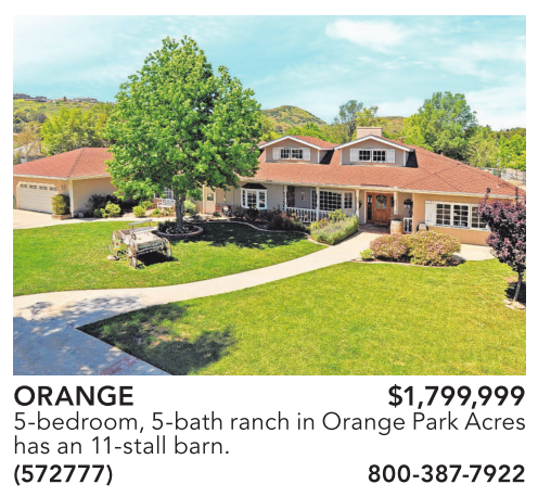 ORANGE $1,799,999 5-bedroom,5-bathranch in Orange Park Acres has an 11-stall barn. (572777) 800-387-7922