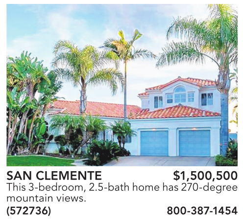SAN CLEMENTE $1,500,500 This 3-bedroom,2.5-bathhomehas 270-degree mountain views. (572736) 800-387-1454