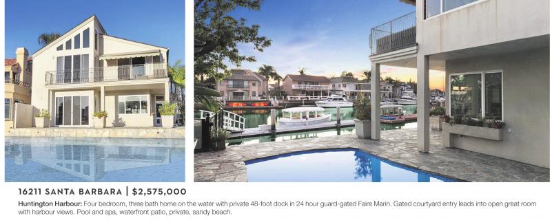 16211 SANTA BARBARA | $2,575,000 Huntington Harbour: Four bedroom, three bath home on the water with private 48-foot dock in 24 hour guard-gated Faire Marin. Gated courtyard entry leads into open great room with harbour views. Pool and spa, waterfront patio, private, sandy beach.