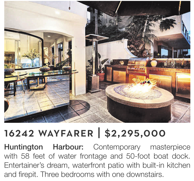 Huntington Harbour: Contemporary masterpiece with 58 feet of water frontage and 50-foot boat dock. Entertainer’s dream, waterfront patio with built-in kitchen and firepit. Three bedrooms with one downstairs.