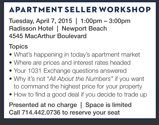 APARTMENT SELLER WORKSHOP Tuesday, April 7, 2015 | 1:00pm – 3:00pm Radisson Hotel | Newport Beach 4545 MacArthur Boulevard Topics • What’s happening in today’s apartment market • Where are prices and interest rates headed • Your 1031 Exchange questions answered • Why it’s not “All About the Numbers” if you want to command the highest price for your property • How to find a good deal if you decide to trade up Presented at no charge | Space is limited Call 714.442.0736 to reserve your seat