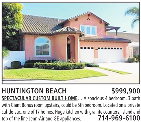HUNTINGTON BEACH $999,900 SPECTACULAR CUSTOM BUILT HOME… Aspacious 4bedroom, 3bath with Giant Bonus room upstairs, could be 5thbedroom. Located on aprivate cul-de-sac,one of 17 homes.Huge kitchen with granitecounters, island and topofthe line Jenn-Air and GE appliances. 714-969-6100