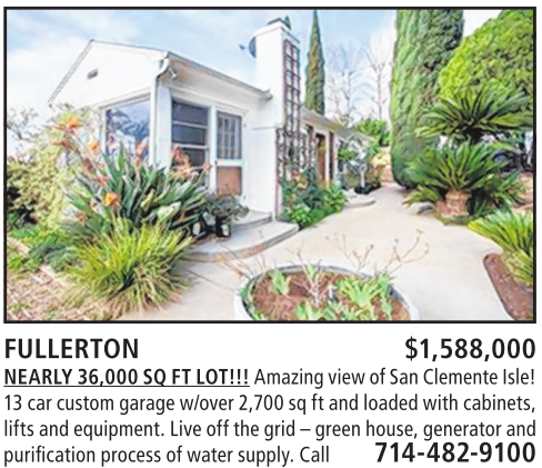 13 carcustomgaragew/over2,700 sq ft andloaded with cabinets, liftsand equipment. Live offthe grid –green house,generator and purificationprocess of water supply.Call 714-482-9100