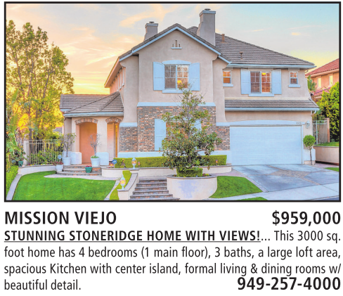 foot home has 4bedrooms (1 main floor), 3baths, alarge loft area, spacious Kitchen with center island, formal living &dining rooms w/ beautifuldetail. 949-257-4000