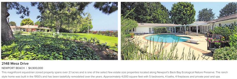 2148 Mesa Drive NEWPORT BEACH | $4,900,000 This magnificent equestrian zoned property spans over 2.1 acres and is one of the select few estate size properties located along Newport’s Back Bay Ecological Nature Preserve. The ranch style home was built in the 1950’s and has been tastefully remodeled over the years. Approximately 4,000 square feet with 5 bedrooms, 4 baths, 4 fireplaces and private pool and spa.