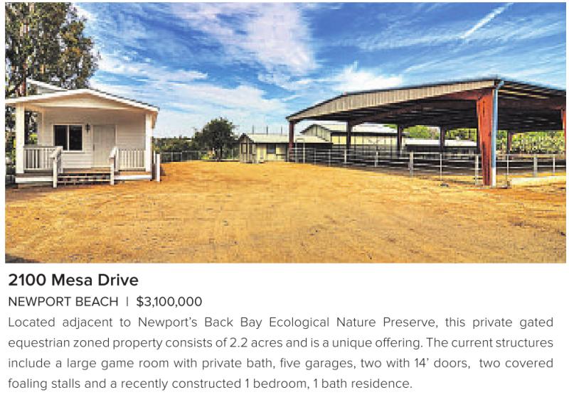 NEWPORT BEACH | $3,100,000 Located adjacent to Newport’s Back Bay Ecological Nature Preserve, this private gated equestrian zoned property consists of 2.2 acres and is aunique offering. Thecurrentstructures include a large game room with private bath, five garages, two with 14’ doors, two covered foaling stalls and a recently constructed 1 bedroom, 1 bath residence.