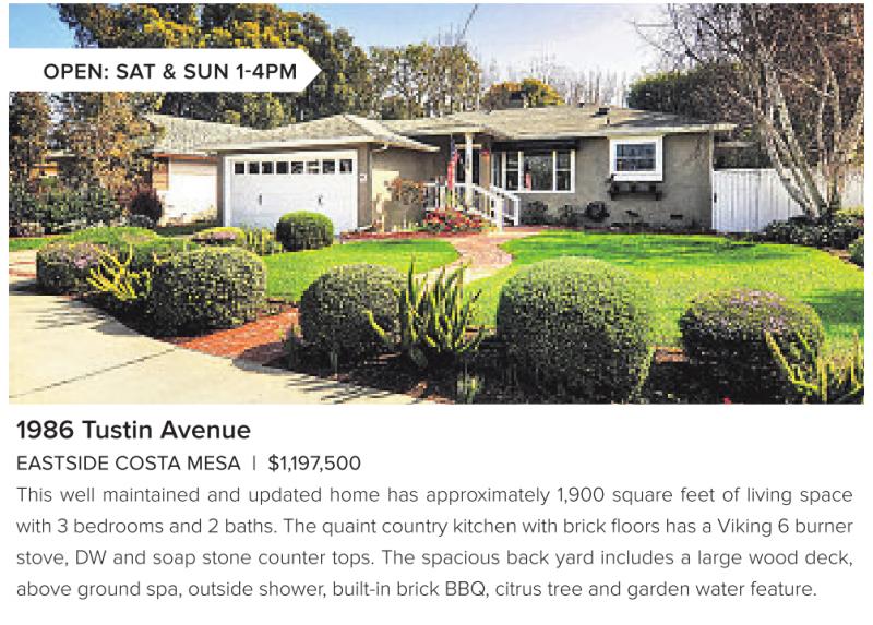 OPEN: SAT & SUN 1-4PM 1986 Tustin Avenue EASTSIDE COSTA MESA | $1,197,500 This well maintained and updated home has approximately 1,900 square feet of living space with 3 bedrooms and 2 baths. The quaint country kitchen with brick floors has a Viking 6 burner stove, DW and soap stone counter tops. The spacious back yard includes a large wood deck, above ground spa, outside shower, built-in brick BBQ, citrus tree and garden water feature.