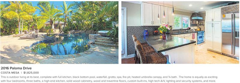 COSTA MESA | $1,825,000 This is outdoor living at its best, complete with full kitchen, black bottom pool, waterfall, grotto, spa, fire pit, heated umbrella canopy, and ¾ bath . The home is equally as exciting with four bedrooms, three baths, a high-end kitchen, solid wood cabinetry, wood and travertine floors, custom built-ins, high tech A/V, lighting and security systems, and more.