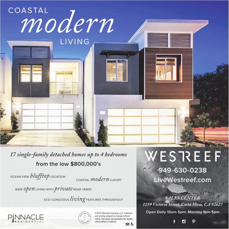 C O A S TA L mode r n L I V I N G 17 single-family detached homes up to 4 bedrooms from the low $800,000’s OCEAN VIEW blufftop LOCATION COASTAL modern LUXURY 949-630-0238 LiveWestreef.com WIDE open LIVING WITH private REAR YARDS ECO-CONSCIOUS living FEATURES THROUGHOUT ©2015 Westreef Housing, LLC. Features and pricing subject to change without notice. See salesrepresentative for details. UNHS BRE# 01198422. SALES CENTER 1259 Victoria Street, Costa Mesa, CA 92627 Open Daily 10am-5pm, Monday 1pm-5pm