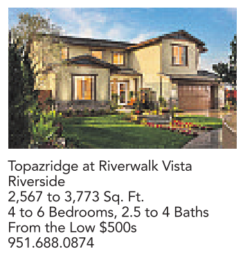 Topazridge atRiverwalk Vista Riverside 2,567 to 3,773 Sq. Ft. 4to6Bedrooms, 2.5 to 4Baths From the Low $500s 951.688.0874