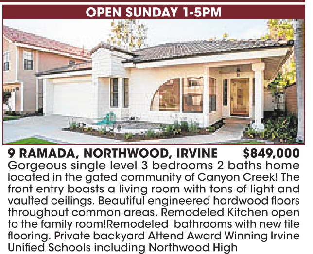 OPEN SUNDAY 1-5PM 9 RAMADA, NORTHWOOD, IRVINE $849,000 Gorgeous single level 3 bedrooms 2 baths home located in the gated community of Canyon Creek! The front entry boasts a living room with tons of light and vaulted ceilings. Beautiful engineered hardwood floors throughout common areas. Remodeled Kitchen open to the family room!Remodeled bathrooms with new tile flooring. Private backyard Attend Award Winning Irvine Unified Schools including Northwood High
