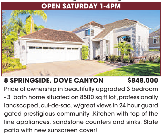 OPEN SATURDAY 1-4PM 8 SPRINGSIDE, DOVE CANYON $848,000 Pride of ownership in beautifully upgraded 3 bedroom - 3 bath home situated on 8500 sq ft lot ,professionally landscaped ,cul-de-sac, w/great views in24hour guard gated prestigious community .Kitchen with top of the line appliances, sandstone counters and sinks. Slate patio with new sunscreen cover!