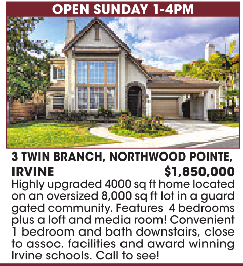 OPEN SUNDAY 1-4PM 3 TWIN BRANCH, NORTHWOOD POINTE, IRVINE $1,850,000 Highly upgraded 4000 sq ft home located on an oversized 8,000 sq ft lot in a guard gated community. Features 4bedrooms plus a loft and media room! Convenient 1 bedroom and bath downstairs, close to assoc. facilities and award winning Irvine schools. Call to see!