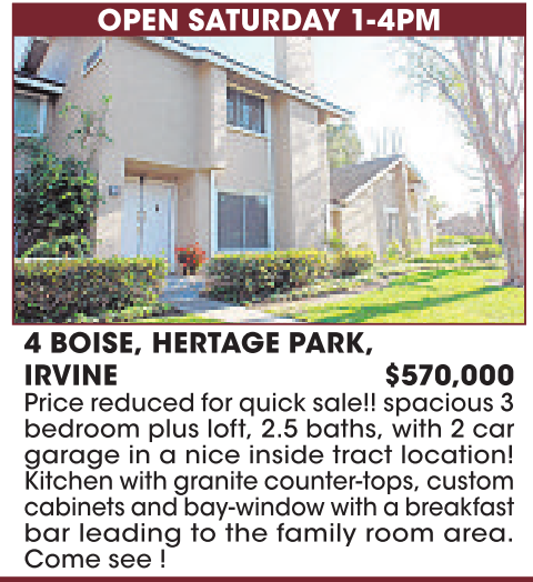 4 BOISE, HERTAGE PARK, IRVINE $570,000 Price reduced for quick sale!! spacious 3bedroom plus loft, 2.5 baths, with 2 car garage in a nice inside tract location! Kitchenwith granitecounter-tops,custom cabinetsand bay-windowwithabreakfast bar leading to the family room area. Come see !OPEN SATURDAY 1-4PM