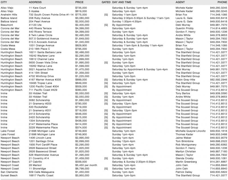 Aliso Viejo 11 Kara Court $735,000 Saturday & Sunday 1pm-4pm Michele Kader 949.280.3245 Aliso Viejo 5 Azalea $619,000 Saturday 1pm-4pm Michele Kader 949.280.3245 Anaheim Hills 732 South Crown Pointe Drive #1-14 $775,000 [G] Saturday 11am-2pm Brian Fox 714.348.1085 Balboa Island 208 Ruby Avenue $3,080,000 Saturday 2:30pm-5:30pm & Sunday 11am-1pm Laura G. Gale 949.500.6418 Balboa Island 204 Pearl Avenue $2,500,000 Sunday 1:30pm-4:30pm Laura G. Gale 949.500.6418 Beaumont 41120 Ute $2,400,000 [G] By Appointment Debi Murray 949.981.7570 Corona del Mar 440 Rivera Terrace $4,399,000 Saturday 1pm-4pm Quentin Priddy 714.814.4663 Corona del Mar 440 Rivera Terrace $4,399,000 Sunday 1pm-4pm Gordon F. Henry 949.500.1236 Corona del Mar 8 Twin Lakes Circle $2,495,000 Saturday & Sunday 1pm-4pm Andre White 949.378.9653 Corona del Mar 507.5 Goldenrod Avenue $1,649,000 Saturday & Sunday 1pm-4pm Mason | Taylor 949.294.7832 Corona del Mar 512.5 Avocado Avenue $1,345,000 Saturday & Sunday 1pm-4pm Mason | Taylor 949.294.7832 Costa Mesa 1531 Orange Avenue $829,900 Saturday 11am-5pm & Sunday 11am-4pm Brian Fox 714.348.1085 Costa Mesa 210 16th Place C $795,000 Sunday 1pm-4pm Mason | Taylor 949.294.7832 Huntington Beach 16211 Santa Barbara Lane $2,488,000 Saturday 1pm-5pm The Stanfield Group 714.421.3377 Huntington Beach 16242 Wayfarer Lane $2,295,000 Saturday 1pm-5pm The Stanfield Group 714.421.3377 Huntington Beach 16612 Channel Lane $1,899,000 Sunday 1pm-5pm The Stanfield Group 714.421.3377 Huntington Beach 5635 Ocean Vista Drive $1,895,000 [G] Sunday 1pm-5pm The Stanfield Group 714.421.3377 Huntington Beach 16262 Walrus Lane $1,599,000 Saturday 1pm-5pm The Stanfield Group 714.421.3377 Huntington Beach 3521 Aquarius Drive $1,475,000 Saturday by Appointment & Sunday 1pm-4pm Debi Murray 949.981.7570 Huntington Beach 414 15th Street $1,358,000 Sunday 1pm-5pm The Stanfield Group 714.421.3377 Huntington Beach 4702 Winthrop Drive $1,225,000 Saturday 1pm-5pm The Stanfield Group 714.421.3377 Huntington Beach 4167 Warner Avenue #205 $899,000 [G] Saturday & Sunday 1pm-4pm Robin Gray-Hite 562.592.2946 Huntington Beach 16495 Tropez Lane $849,000 [G] Saturday 1pm-5pm The Stanfield Group 714.421.3377 Huntington Beach 1200 Pacific Coast #304 $509,000 [G] By Appointment Debi Murray 949.981.7570 Huntington Beach 711 Pacific Coast #429 $380,000 By Appointment The Soussé Group 714.412.8512 Irvine 33 Hidden Trail $2,550,000 [G] Saturday 1pm-4pm Tony Bartos 949.939.3390 Irvine 33 Hidden Trail $2,550,000 [G] Sunday 1pm-4pm Andre White 949.378.9653 Irvine 3082 Scholarship $1,680,000 [G] By Appointment The Soussé Group 714.412.8512 Irvine 21 Gramercy #203 $790,000 [G] Saturday 12pm-3pm The Soussé Group 714.412.8512 Irvine 533 Rockefeller $719,000 By Appointment The Soussé Group 714.412.8512 Irvine 21 Gramercy #201 $718,000 [G] Saturday 12pm-3pm The Soussé Group 714.412.8512 Irvine 2413 Scholarship $548,000 [G] By Appointment The Soussé Group 714.412.8512 Irvine 2420 Scholarship $515,000 [G] By Appointment The Soussé Group 714.412.8512 Irvine 1334 Scholarship $438,000 [G] By Appointment The Soussé Group 714.412.8512 Irvine 2147 Watermarke Place $414,000 [G] By Appointment The Soussé Group 714.412.8512 Irvine 3228 Watermarke Place $374,500 [G] By Appointment The Soussé Group 714.412.8512 Lake Forest 21896 Michigan Lane $749,900 Saturday 1pm-4pm Michelle Queyrel Linovitz 949.632.1618 Lake Forest 21896 Michigan Lane $749,900 Sunday 1pm-4pm Thomas Kadar 949.933.0488 Newport Beach 1406 Lincoln Lane $2,895,000 Sunday 1pm-4pm Jaime Weber 949.922.9079 Newport Beach 1201 Santiago Drive $2,699,000 Sunday 12pm-4pm Tom Birkinbine 949.698.2522 Newport Beach 1935 Port Cardiff Place $2,295,000 Sunday 1pm-4pm Rob Montgomery 949.280.6362 Newport Beach 2626 Basswood Street $1,825,000 Saturday 1pm-4pm Gordon F. Henry 949.500.1236 Newport Beach 2626 Basswood Street $1,825,000 Sunday 1pm-4pm Marilyn Christian 949.887.7160 Newport Beach 526 Westminster Avenue $1,495,000 Saturday & Sunday 1pm-4pm Mason | Taylor 949.294.7832 Newport Beach 21 Coventry #14 $1,459,000 [G] Sunday 1pm-4pm Glenda Crosby 949.500.1081 Newport Beach 27 Cabrillo $339,500 Saturday & Sunday 2:30pm-5:30pm Martin Greenberg 914.261.6867 Newport Coast 28 Marisol $5,450 per month Saturday 1pm-4pm John Cain 714.655.8940 Newport Coast 11 Shoreridge $6,798,000 [G] Saturday 1pm-4pm John Cain 714.655.8940 San Clemente 509 Calle Malaguena $1,450,000 Sunday 1pm-4pm Patrick Dailey 949.630.5822 Sunset Beach 16617 Pacific Coast $3,950,000 Saturday 1pm-5pm The Stanfield Group 714.421.3377
