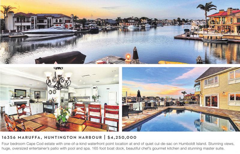 16356 MARUFFA, HUNTINGTON HARBOUR | $4,250,000 Four bedroom Cape Cod estate with one-of-a-kind waterfront point location at end of quiet cul-de-sac on Humboldt Island. Stunning views, huge, oversized entertainer’s patio with pool and spa. 165 foot boat dock, beautiful chef’s gourmet kitchen and stunning master suite.