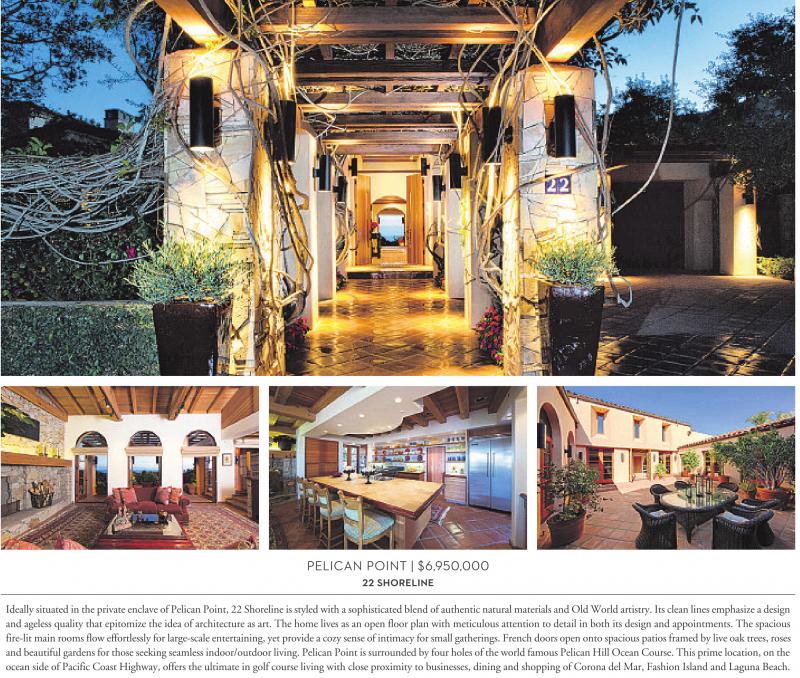 PELICAN POINT | $6,950,000 22 SHORELINE Ideally situated in the private enclave of Pelican Point, 22 Shoreline is styled with asophisticated blend of authentic natural materials and Old World artistry. Its clean lines emphasize adesign and ageless quality that epitomize the idea of architecture as art. The home lives as an open floor plan with meticulous attention to detail in both its design and appointments. The spacious fire-lit main rooms flow effortlessly for large-scale entertaining, yet provide acozy sense of intimacy for small gatherings. French doors open onto spacious patios framed by live oak trees, roses and beautiful gardens for those seeking seamless indoor/outdoor living. Pelican Point is surrounded by four holes of the world famous Pelican Hill OceanCourse. This prime location,onthe ocean side of Pacific Coast Highway, offers the ultimate in golf course living with close proximity to businesses, dining and shopping of Corona del Mar, Fashion Island and Laguna Beach.
