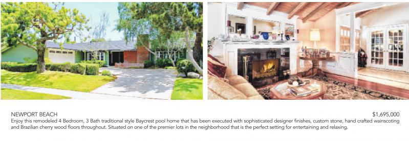 NEWPORT BEACH $1,695,000 Enjoy this remodeled 4 Bedroom, 3 Bath traditional style Baycrest pool home that has been executed with sophisticated designer finishes, custom stone, hand crafted wainscoting and Brazilian cherry wood floors throughout. Situated on one of the premier lots in the neighborhood that is the perfect setting for entertaining and relaxing.