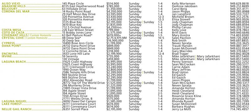 ALISO VIEJO.............................................. 145 Playa Circle $514,900 Sunday 1-4 Kelly Mortensen 949.629.8618 ANAHEIM HILLS...........................................8725 East Heatherwood Road $785,000 Saturday 1-4 DeAnne Jakobsen 949.212.8699 BELCOURT.....................................................63 Hillsdale Drive $1,350,000 Sunday 1-4 Carol Berg 949.351.4171 CORONA DEL MAR ......................................14 Rocky Point Road $4,350,000 Saturday 1-4 Jason Phipps 949.285.8988 29 Half Moon Bay Drive $3,595,000 Sunday 1-4 Jan Langford 949.533.7337 320 Poinsettia Avenue $3,430,000 Saturday 12-3 Michelle Brown 949.212.2576 320 Poinsettia Avenue $3,430,000 Sunday 12-3 Eliisa Stowell 949.903.0026 3725 Blue Key $2,195,000 Saturday | Sunday 1-5 Jody Chapman 949.689.8594 3610 Blue Key $1,835,000 Saturday 1-3 Jody Chapman 949.689.8594 712.5 Orchid Avenue $4,250/mo. Sunday 1-4 Phillip Caruso 949.293.7334 COSTA MESA ................................................226 East Wilson Street $799,000 Sunday 1-4 Kelly Love 949.478.7863 COTO DE CAZA ............................................15 Bobby Jones Lane $1,575,000 Saturday | Sunday 1-4 Britt Davis 949.940.6646 COVENANT HILLS | Custom Homesite ........... 63 Bell Pasture Road* $619,000+ Saturday | Sunday 1-5 Mary Kontra 714.403.6500 CRYSTAL COVE | Custom Homesite ............... 48 Deep Sea* $2.75-6.975 MM Saturday 10-5 Sales Pavilion 949.720.2683 30 Deep Sea $16,900,000 Sunday 1-4 Rob Smith 949.697.8855 CYPRESS........................................................10490 Rose Ann Circle $1,199,000 Sunday 1-5 Neven Spralja 949.233.3625 DANA POINT.................................................24732 Dana Point Drive $849,000 Saturday 1-4 Traudi Hansen 949.887.3417 24732 Dana Point Drive $849,000 Sunday 1-4 Susan McDonnell 949.632.0544 12 Corniche Drive, A $318,000 Sunday 1-4 Gary Macrides 949.370.6827 ENCINITAS.....................................................3433 Lone Hill Lane $2,199,900 Saturday 12-4 Brad Trager 949.842.8028 IRVINE............................................................59 Serenity $735,000 Saturday 1-5 Mike Jafarkhani | Mary Jafarkhani 949.857.5400 130 Vintage $459,800 Saturday 1-5 Mike Jafarkhani | Mary Jafarkhani 949.857.5400 LAGUNA BEACH...........................................31625 Coast Highway $5,995,000 Saturday 1-4 Penny Svenson 949.632.2252 31625 Coast Highway $5,995,000 Sunday 1-4 Sean McCracken 949.290.5317 3271 Crestwood Circle $3,240,000 Sunday 1-4 Carrie Adam 949.322.3985 1990 Ocean Way $2,800,000 Saturday 1-4 Mary Jeffries 949.463.6020 2586 Temple Hills Drive $2,399,000 Saturday | Sunday 1-4 Brad Upton 949.633.8824 969 Skyline Drive $2,295,000 Saturday 1-5 Ed Gazich 949.235.9936 969 Skyline Drive $2,295,000 Sunday 1-4 Ed Gazich 949.235.9936 2852 Alexander Road $1,799,000 Sunday 1-4 Jason Phipps 949.285.8988 28772 Top Of The World Drive $1,525,000 Saturday | Sunday 1-4 Sean McCracken 949.290.5317 296 Monterey Drive $1,225,000 Saturday 1-5 Neven Spralja 949.233.3625 21805 Ocean Vista Drive $1,199,000 Sunday 1-4 Amanda Horton 949.422.6122 394 Agate Street $1,095,000 Saturday 1-4 Heidi Cleveland 949.371.4333 394 Agate Street $1,095,000 Sunday 2-5 Heidi Cleveland 949.371.4333 1550 Arroyo Drive $920,000 Sunday 1-4 Rosanne Grace Kline 949.378.5809 21711 Wesley Drive, B $575,000 Saturday 1-4 Amanda Horton 949.422.6122 LAGUNA NIGUEL..........................................24092 Paseo Del Campo $1,585,000 Sunday 1-4 Rhonda Russell 949.395.7399 LAKE FOREST................................................26111 Connemara Court $674,000 Saturday 1-4 Susan McDonnell 949.632.0544 26111 Connemara Court $674,000 Sunday 1-4 Barbara Hughes 949.290.4312 NELLIE GAIL RANCH....................................26351 Sorrell Place $2,195,000 Sunday 1-4 Jerry La Mott 714.745.4957