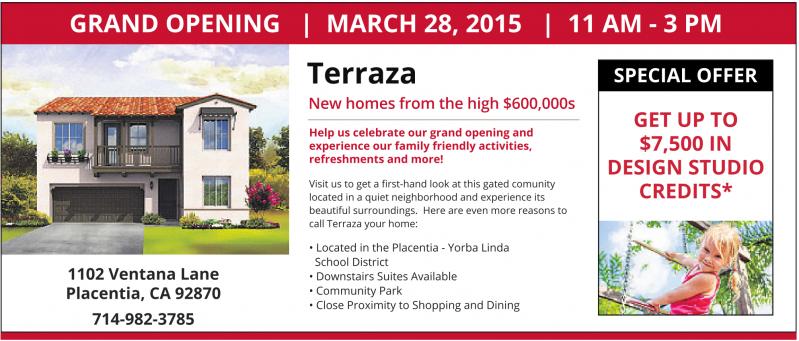 GRAND OPENING | MARCH 28, 2015 | 11 AM - 3 PM Terraza New homes from the high $600,000s Help us celebrate our grand opening and experience our family friendly activities, refreshments and more! SPECIAL OFFER GET UP TO $7,500 IN DESIGN STUDIO CREDITS* 1102 Ventana Lane Placentia, CA 92870 714-982-3785