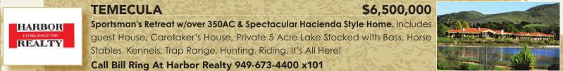 TEMECULA $6,500,000 Sportsman’s Retreat w/over 350AC & Spectacular Hacienda Style Home. Includes guest House, Caretaker’s House, Private 5 Acre Lake Stocked with Bass, Horse Stables, Kennels, Trap Range, Hunting, Riding, It’s All Here! Call Bill Ring At Harbor Realty 949-673-4400 x101
