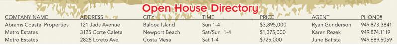 COMPANY NAME ADDRESS CITY TIME PRICE AGENT PHONE# Abrams Coastal Properties 121 Jade Avenue Balboa Island Sun 1-4 $3,895,000 Ryan Gunderson 949.873.3841 Metro Estates 3125 Corte Caleta Newport Beach Sat/Sun 1-4 $1,375,000 Karen Rezek 949.874.1119 Metro Estates 2828 Loreto Ave. Costa Mesa Sat 1-4 $725,000 June Batista 949.689.5059