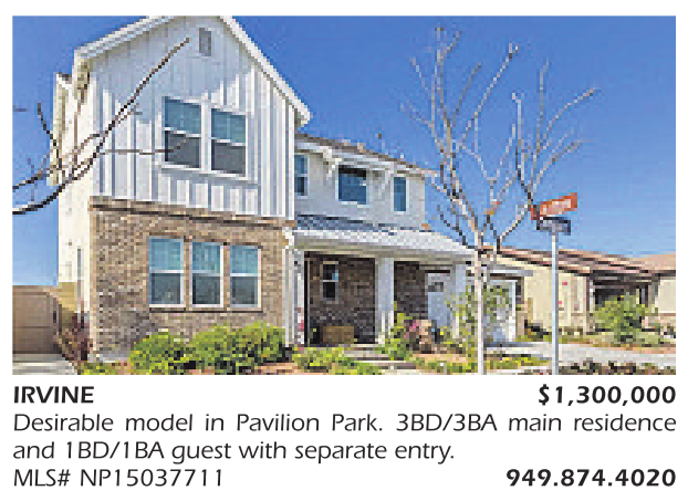 IRVINE $1,300,000 Desirable model in Pavilion Park. 3BD/3BA main residence and 1BD/1BA guest with separate entry. MLS# NP15037711 949.874.4020