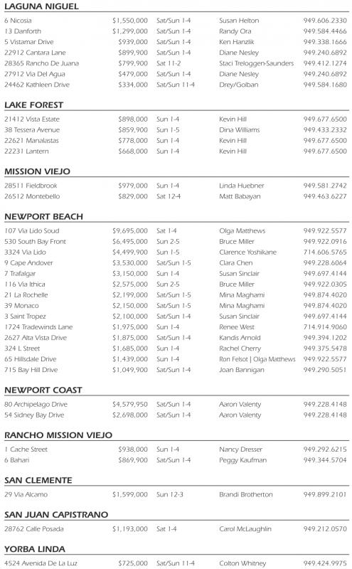 NEWPORT BEACH 107 Via Lido Soud $9,695,000 Sat 1-4 Olga Matthews 949.922.5577 530 South Bay Front $6,495,000 Sun 2-5 Bruce Miller 949.922.0916 3324 Via Lido $4,499,900 Sun 1-5 Clarence Yoshikane 714.606.5765 9Cape Andover $3,530,000 Sat/Sun 1-5 Clara Chen 949.228.6064 7Trafalgar $3,150,000 Sun 1-4 Susan Sinclair 949.697.4144 116 Via Ithica $2,575,000 Sun 2-5 Bruce Miller 949.922.0305 21 La Rochelle $2,199,000 Sat/Sun 1-5 Mina Maghami 949.874.4020 39 Monaco $2,150,000 Sat/Sun 1-5 Mina Maghami 949.874.4020 3Saint Tropez $2,100,000 Sat/Sun 1-4 Susan Sinclair 949.697.4144 1724 Tradewinds Lane $1,975,000 Sun 1-4 Renee West 714.914.9060 2627 Alta Vista Drive $1,875,000 Sat/Sun 1-4 Kandis Arnold 949.394.1202 324 LStreet $1,685,000 Sun 1-4 Rachel Cherry 949.375.5478 65 Hillsdale Drive $1,439,000 Sun 1-4 Ron Felsot |Olga Matthews 949.922.5577 715 Bay Hill Drive $1,049,900 Sat/Sun 1-4 Joan Bannigan 949.290.5051