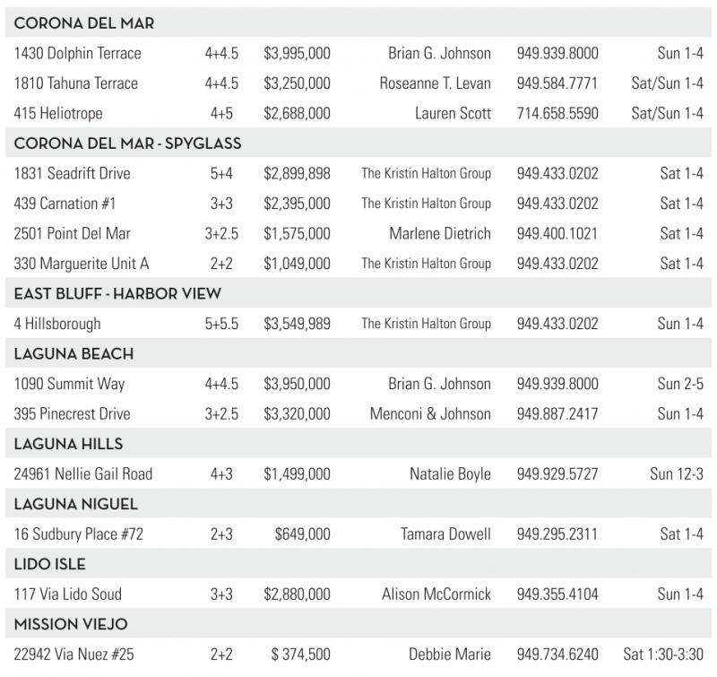 CORONA DEL MAR 1430 Dolphin Terrace 4+4.5 $3,995,000 Brian G. Johnson 949.939.8000 Sun 1-4 1810 Tahuna Terrace 4+4.5 $3,250,000 Roseanne T. Levan 949.584.7771 Sat/Sun 1-4 415 Heliotrope 4+5 $2,688,000 Lauren Scott 714.658.5590 Sat/Sun 1-4 CORONA DEL MAR -SPYG SS 1831 Seadrift Drive 5+4 $2,899,898 The Kristin Halton Group 949.433.0202 Sat 1-4 439 Carnation #1 3+3 $2,395,000 The Kristin Halton Group 949.433.0202 Sat 1-4 2501 Point Del Mar 3+2.5 $1,575,000 Marlene Dietrich 949.400.1021 Sat 1-4 330 Marguerite Unit A 2+2 $1,049,000 The Kristin Halton Group 949.433.0202 Sat 1-4 EASTBLUFF -HARBOR VIEW 4Hillsborough 5+5.5 $3,549,989 The Kristin Halton Group 949.433.0202 Sun 1-4 GUNA BEACH 1090 Summit Way 4+4.5 $3,950,000 Brian G. Johnson 949.939.8000 Sun 2-5 395 Pinecrest Drive 3+2.5 $3,320,000 Menconi &Johnson 949.887.2417 Sun 1-4 GUNA HILLS 24961 Nellie Gail Road 4+3 $1,499,000 Natalie Boyle 949.929.5727 Sun 12-3 GUNA NIGUEL 16 Sudbury Place #72 2+3 $649,000 Tamara Dowell 949.295.2311 Sat 1-4 LIDO ISLE 117 ViaLidoSoud 3+3 $2,880,000 Alison McCormick 949.355.4104 Sun 1-4 MISSION VIEJO 22942 ViaNuez#25 2+2 $374,500 Debbie Marie 949.734.6240 Sat 1:30-3:30