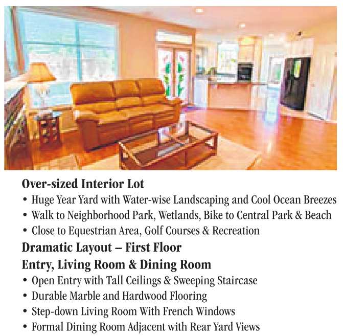 Over-sized Interior Lot • Huge Year Yard with Water-wise Landscapingand CoolOcean Breezes • Walk to Neighborhood Park,Wetlands, Bike to CentralPark&Beach • Close to Equestrian Area,GolfCourses &Recreation Dramatic Layout – First Floor Entry, Living Room & Dining Room • OpenEntry with Tall Ceilings &SweepingStaircase • Durable Marble andHardwoodFlooring • Step-down Living Room With French Windows • FormalDining Room Adjacent with Rear Yard Views