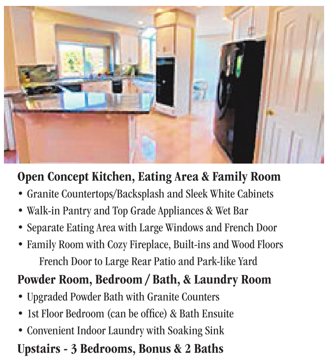 Open Concept Kitchen, Eating Area & Family Room • Granite Countertops/Backsplash andSleek WhiteCabinets • Walk-inPantryand TopGrade Appliances &Wet Bar • SeparateEatingAreawithLarge Windowsand French Door • FamilyRoomwithCozyFireplace, Built-insand Wood Floors French DoortoLarge Rear Patioand Park-likeYard Powder Room, Bedroom / Bath, & Laundry Room • UpgradedPowderBathwithGranite Counters • 1st FloorBedroom(canbeoffice)&Bath Ensuite • ConvenientIndoorLaundry with SoakingSink